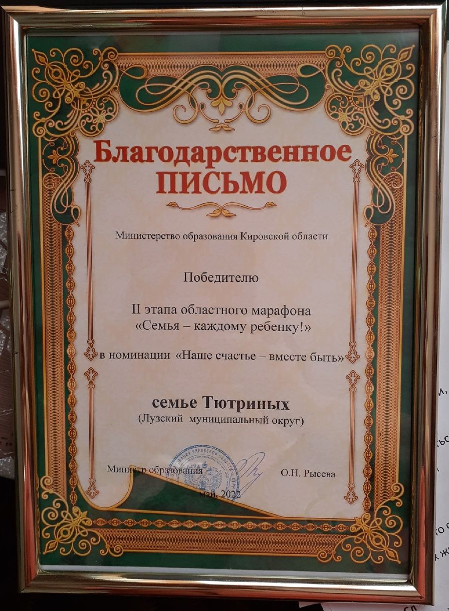 Министерство образования Кировской области отметило каждую семью тёплыми словами, благодарственными письмами и подарками. Семья Игорь Владимирович и Любовь Юрьевна признана победителем II этапа областного марафона «Семья – каждому ребенку!» в номинации «Наше счастье – вместе быть».